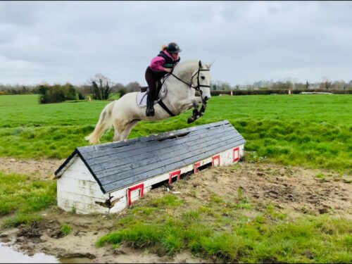 Snowball enjoys cross country and proves to be brave and honest to new fences, and well behaved in open fields
